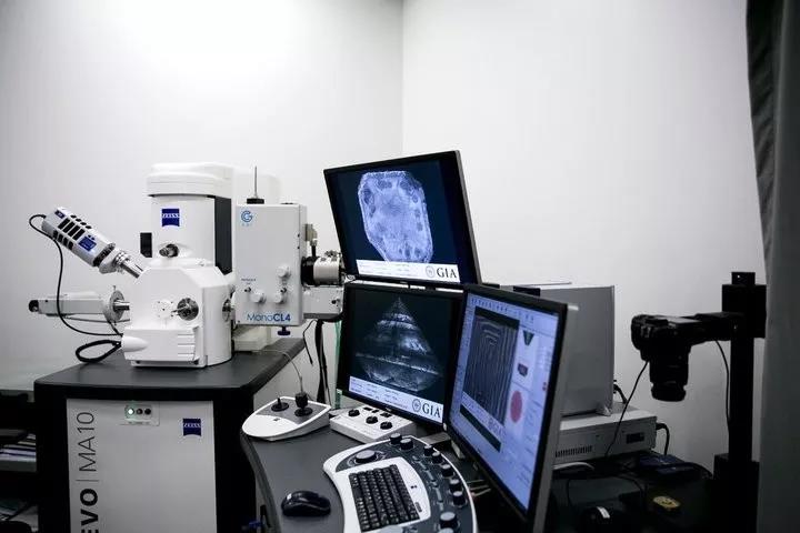 用SEM对钻石的表面形貌进行观察,观察钻石生长表面形成的台阶等特征,用CL附件对钻石产生的荧光波段进行分析,从而判断钻石是否为天然钻石。
